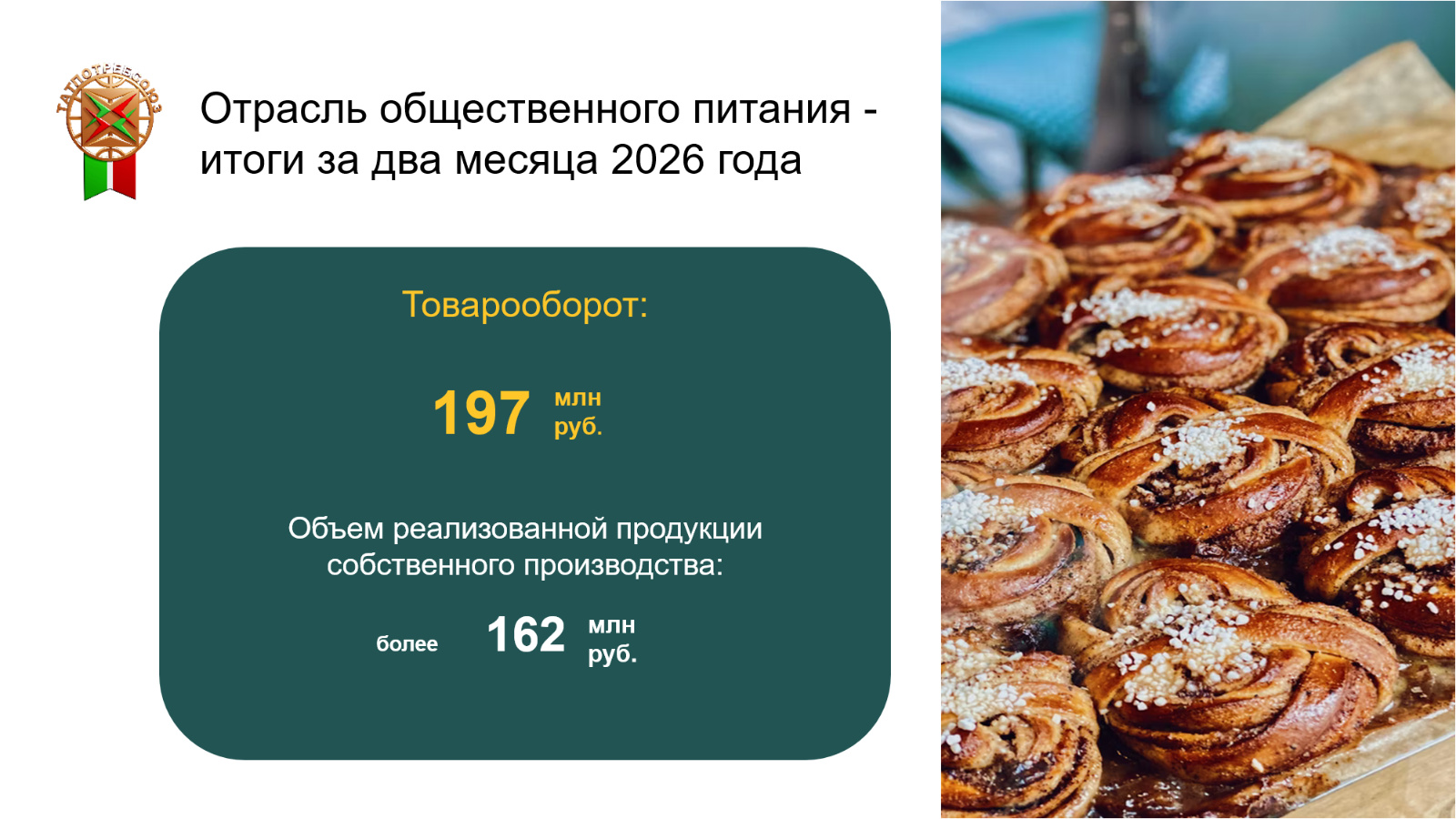 В отрасли общественного питания обеспечен товарооборот в сумме 197 млн рублей.Основную долю в этом объеме занимает продукция собственного производства, реализация которой принесла более 162 млн рублей.Удельный вес собственной продукции составил 82 процента.