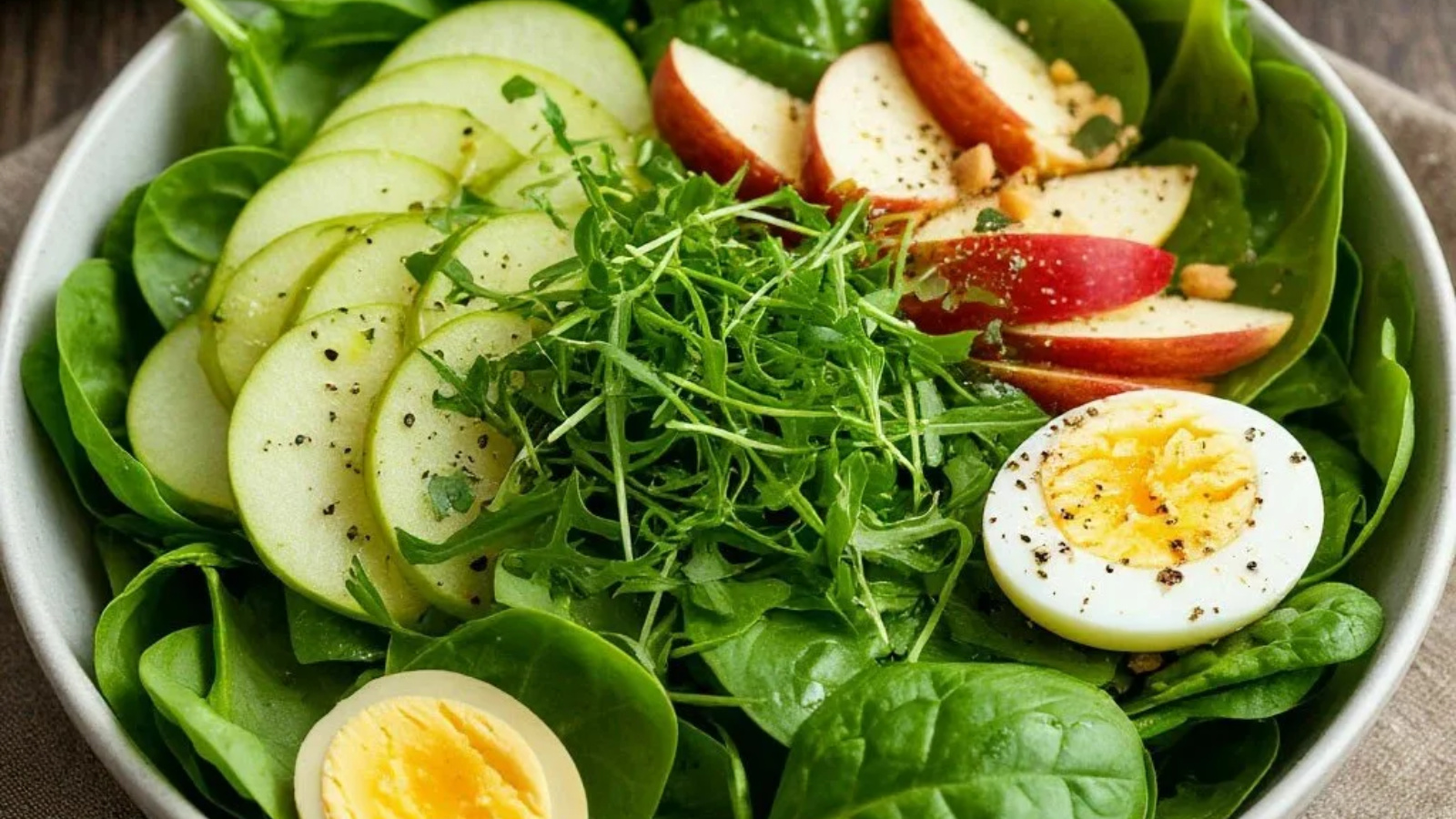 Шпинат, щавель, рукколу, зелёный лук промывают, обсушивают. Яблоко очищают от кожицы, удаляют сердцевину, нарезают тонкими дольками и сбрызгивают лимонным соком. Отваренное яйцо разрезают пополам. Все компоненты соединяют, добавляют соль и перец, заправляют соусом перед подачей.